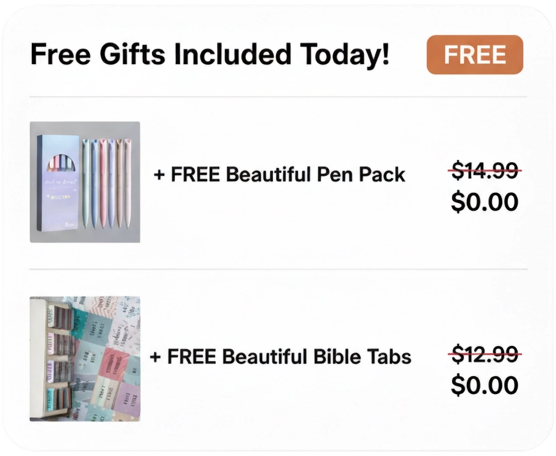 Works with any Bible translation you love. NLT, NIV, ESV, KJV, or whatever feels right for you. Every order also includes a free pen pack and Bible tabs.
